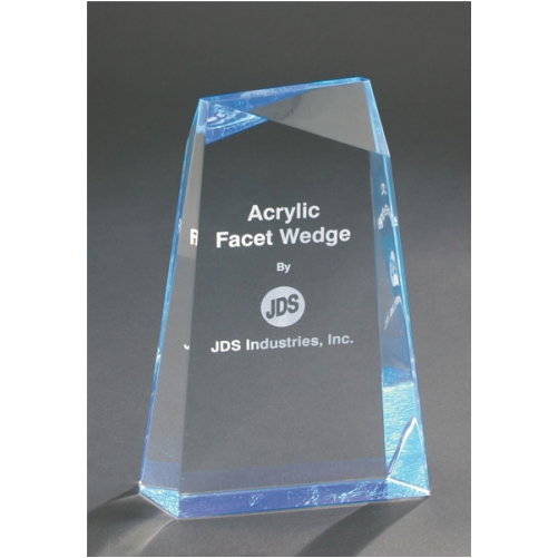 Facet Wedge Acrylics are 1-1/4" thick and self standing. This acrylic is great for all needs. Your custom logo can be added at no extra charge.