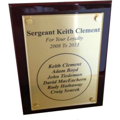 This is the pinnacle of plaque designs. The acrylic is elevated 1/4" above the plaque with gold metal standoffs and a full color plate underneath. A shiny high gloss finish covers the entire board with an elegant rosewood color. Designed with a felt back for added elegance.